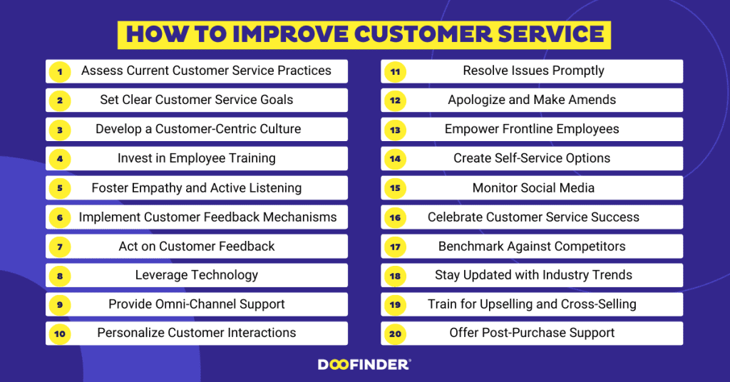 All articles Doofinder > Blog > Marketing > 25 Customer Service Tips for Better Reviews in 2024 25 Customer Service Tips for Better Reviews in 2024 Abigail Bosze 10 min CONTENTS Customer service is undeniably the bedrock of a thriving business, playing a pivotal role in shaping the overall customer experience. It encompasses the support and assistance offered to customers not only during their purchase journey but also before and after their interactions with a company. The impact of exceptional customer service is profound, capable of transforming a one-time buyer into a devoted, repeat customer while fostering positive reviews and word-of-mouth referrals. In this article, we embark on a journey to explore the significance of customer service, delving into ways to enhance its quality. We’ll delve into 25 invaluable customer service tips and tricks that are bound to elevate your customer experience and set your business apart from the rest. By the end of this read, you’ll be equipped with the knowledge and strategies necessary to build lasting relationships with your customers and cultivate a loyal clientele base. So, let’s dive in and unlock the secrets to unparalleled customer service excellence! What is Customer Service? Customer service is the support and assistance provided to customers before, during, and after their purchase. It’s the backbone of any successful business. It’s not just about resolving complaints; it’s about creating an outstanding experience that leaves customers feeling valued and satisfied. Exceptional customer service goes beyond meeting basic needs; it involves anticipating and exceeding expectations. It’s about building strong relationships with your customers, fostering loyalty, and establishing a positive brand reputation. Ultimately, customer service is the key differentiator that sets businesses apart in today’s competitive landscape. Why is Customer Service Important? Customer service plays a vital role in determining the success of any business. Here’s why it’s so important: Customer Retention: Excellent customer service fosters loyalty and keeps customers coming back for more. Word-of-Mouth Marketing: Satisfied customers are more likely to share their positive experiences, which can lead to new customers. Brand Reputation: Good customer service enhances your brand’s reputation and sets you apart from competitors. Profitability: Happy customers tend to spend more and are less price-sensitive. Feedback and Improvement: Through customer interactions, you can gain valuable feedback to improve your products and services. Crisis Management: During difficult times, strong customer service can help mitigate negative impacts. The significance of customer service cannot be stressed enough. It has a profound impact on your brand reputation and bottom line. Happy customers become loyal advocates, spreading positive word-of-mouth and driving new business. On the other hand, poor customer service can lead to negative reviews and a damaged image, which can be hard to recover from. According to a study conducted by Zendesk: 86% of customers are willing to pay more for better customer service. 95% of customers share bad experiences with others. 87% of customers share good experiences. These statistics highlight the immense value of providing exceptional customer service. When customers have positive experiences, they are more likely to become repeat buyers and refer others to your business. This leads to increased customer retention, higher sales, and a stronger bottom line. Additionally, satisfied customers can become brand ambassadors, helping to build your reputation and attract new customers organically. How to Improve Customer Service Improving customer service is an ongoing journey that requires dedication, adaptability, and a customer-centric mindset. Here are some practical steps to take your customer service to the next level: 1. Assess Current Customer Service Practices: Begin by evaluating your current customer service processes. Identify strengths and weaknesses to understand where improvements are needed. 2. Set Clear Customer Service Goals: Define specific, measurable, achievable, relevant, and time-bound (SMART) goals for your customer service team. Having clear objectives will keep everyone focused on continuous improvement. 3. Develop a Customer-Centric Culture: Make customer satisfaction a top priority throughout your organization. Train and empower employees at all levels to prioritize customer needs. 4. Invest in Employee Training: Equip your customer service team with the necessary skills and knowledge to handle various customer interactions effectively. Training should focus on communication, problem-solving, and product knowledge. 5. Foster Empathy and Active Listening: Train your team to be empathetic and actively listen to customers’ concerns. Understanding customers’ emotions and needs will help build trust and rapport. 6. Implement Customer Feedback Mechanisms: Encourage customers to provide feedback through surveys, reviews, and other channels. Analyze this feedback to identify areas for improvement. 7. Act on Customer Feedback: Use the feedback you receive to make meaningful changes to your products, services, and processes. Communicate to customers that their input is valued and taken seriously. 8. Leverage Technology: Use customer service tools like CRM software, chatbots, and ticketing systems to streamline processes and provide faster responses to customer inquiries. 9. Provide Omni-Channel Support: Offer customer support across various channels, including phone, email, live chat, social media, and in-person if applicable. This ensures that customers can reach you in their preferred way. 10. Personalize Customer Interactions: Use customer data to personalize interactions. Address customers by name and tailor responses based on their previous interactions and preferences. 11. Resolve Issues Promptly: Respond to c
